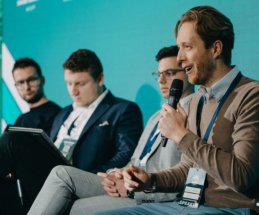 The panel discussion on blockchain and decentralized finance featured CO2IN's product owner Václav Vislous, who debated alongside representatives from Mastercard, Tatum, FinTech Hub CEE, Altlift and Coinmate.
